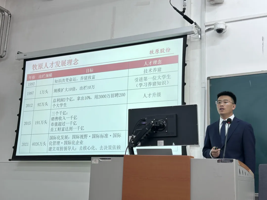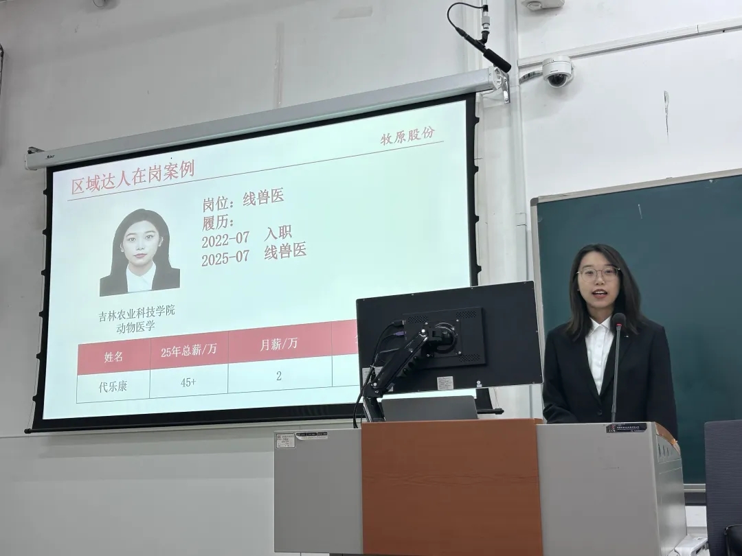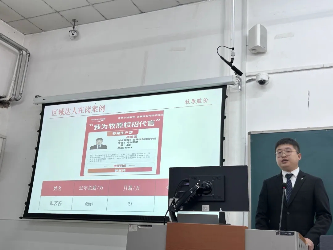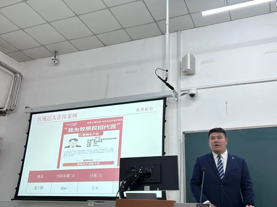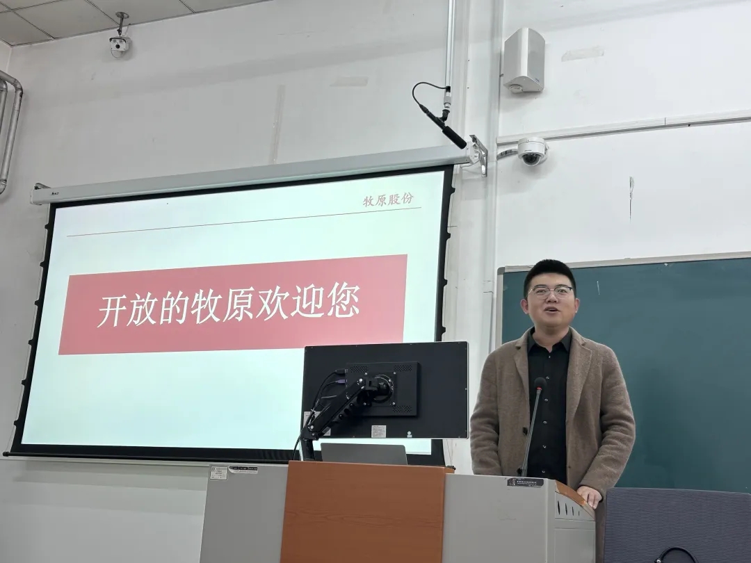 宣讲会上,牧原集团招聘负责人通过播放宣传片、展示PPT的方式,系统介绍了公司的发展历程、企业文化、产业布局、技术创新成果及未来战略蓝图。针对学生关心的职业发展路径、薪酬福利待遇及“传帮带”培养机制等问题,企业招聘团队现场答疑,清晰地勾勒出各岗位的成长路径。