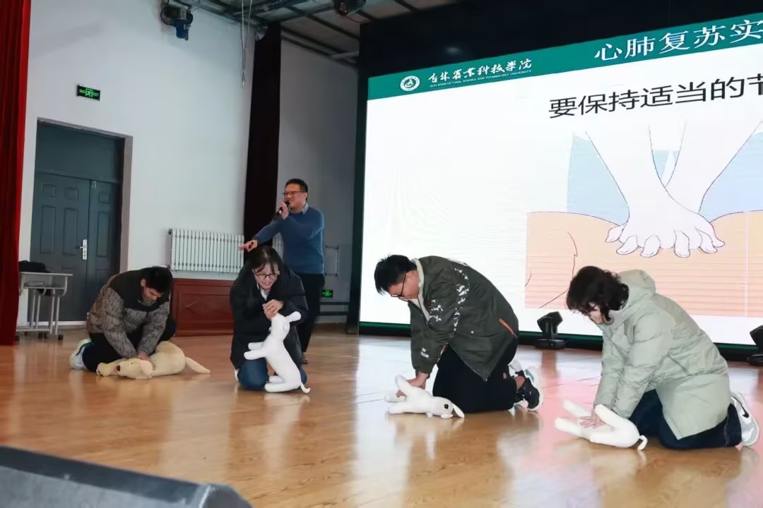 唐琦超结合短头犬鼻腔短、气道狭窄的生理特点,深入浅出地讲解了气道堵塞综合征的诱因与典型症状,强调夏季高温或剧烈运动时需格外警惕,日常饲养要避免过度肥胖、减少闷热环境停留时间。犬心肺复苏培训环节,他以模拟犬为教具,实体演示了宠物无意识、无呼吸时的侧卧胸腔按压急救流程。演示后,现场邀请同学分组实操,他逐一纠正按压位置、频率等细节误区,让大家在实操中掌握关键急救技能。