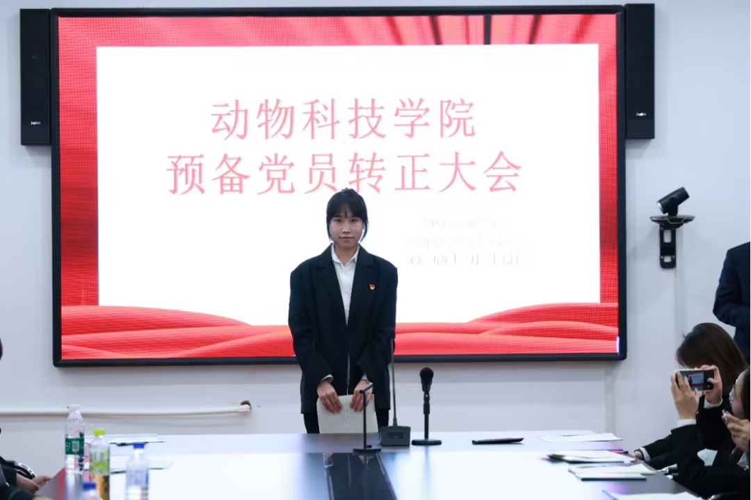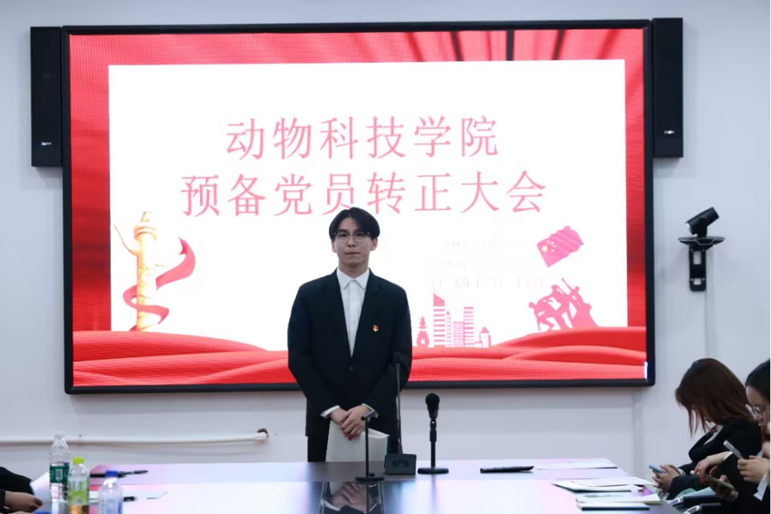孙志博代表学院学生党支部向按期转正的12名同志表示祝贺,同时提出三点要求:一是要筑牢思想根基,持续深化理论学习,始终牢记党员身份,坚定理想信念;二是要立足专业岗位,在科学研究、实践探索、学生工作等领域勇挑重担,发挥先锋模范作用;三是要严守纪律规矩,锤炼优良作风,以实际行动践行初心使命,为学院高质量发展和畜牧兽医事业进步贡献力量。