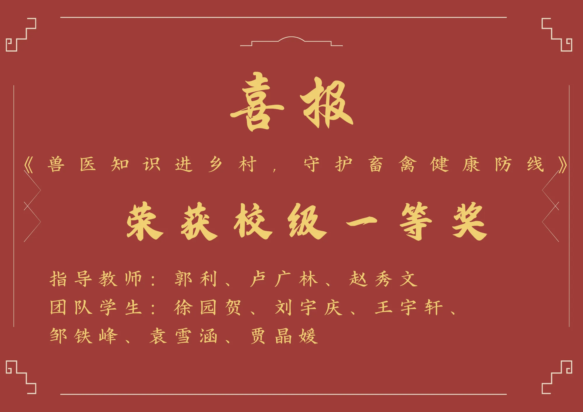 本次社会实践共22支团队参与,累计参与2100余名师生,经过严格的初审与复选,13支优秀团队脱颖而出进入终审答辩环节。各团队在答辩中充分展示实践成果,经过激烈角逐,由我院教师郭利、卢广林、赵秀文带队的《兽医知识进乡村,守护畜禽健康防线》项目斩获校级一等奖。